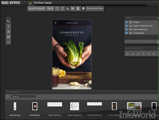 앱 프레스 앱 프레스(App Press, www.app-press.com, 월 30~460달러)는 웹 기반의 노코드 앱 제작 툴로, 아이폰, 아이패드, 안드로이드 애플리케이션을 만들 수 있다. 디자이너에게 맞춰진 앱 프레스는 레이어를 사용할 수 있는 비주얼 애셋(Visual asset)에서 화면을 조합하는 포토샵 방식의 사용자 인터페이스(UI)를 사용한다. 백 엔드는 아마존 클라우드 기반 서비스와 그 플랫폼이다. 업체는 앱 프레스를 처음 접한 디자이너가 앱을 하나 만드는 데 소용되는 시간은 단 하루이며, 익숙해지면 하루에 5개도 제작할 수 있다고 주장한다.