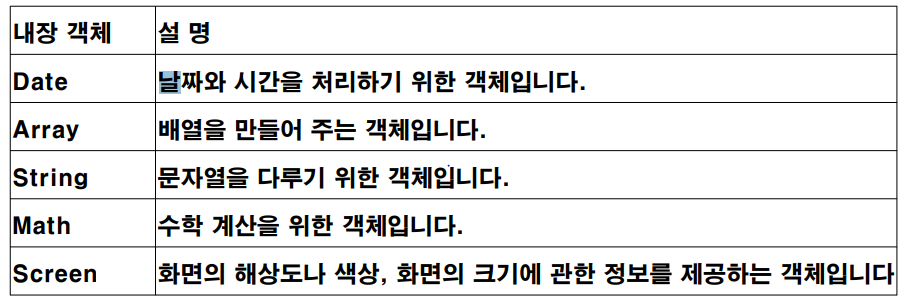 ★내장 객체는 자바 스크립트로 프로그램을 작성하는 동안 자주 사용되는 것들을 묶어서 미리 정의해 놓은 객체