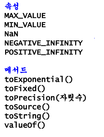 객체 숫자와 관련된 내용을 제어하는 객체로 숫자를 저장하면 생성 Number(“숫자”)의 형태로 사용 가능